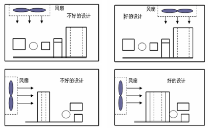 ◆ 對溫度較敏感的零件應該靠近入風口,以保持較低的操作溫度。